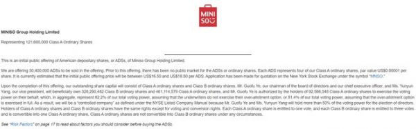 名创优品在F-1表中披露,公司计划在本次IPO中发售3040万股ADS,招股价区间为16.50美元至18.50美元。照此推算,公司将最多募集约5.62亿美元。