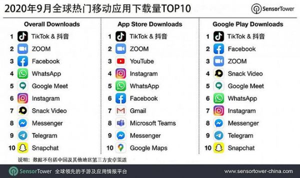 (原标题:2020年9月全球热门移动应用下载量TOP10:抖音及TikTok蝉联冠军)