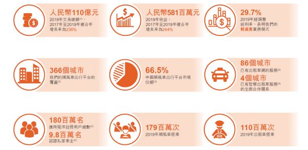 根据Frost & Sullivan弗若斯特沙利文咨询公司(以下简称“F&S”)报告,按2019年搭乘次数计算,嘀嗒在中国顺风车市场排名第一(市占率66.5%),在中国出租车市场的出行平台中排名第二。