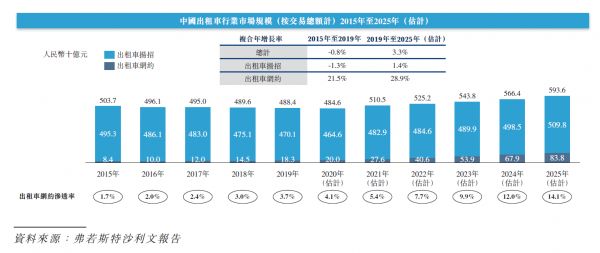 在市场规模方面,根据F&S报告,中国四轮出行市场(出租车扬招、出租车网约、网约车、顺风车)的GTV预计将由2019年的7119亿元增至2025年的11005亿元,复合年增长率将为7.5%。