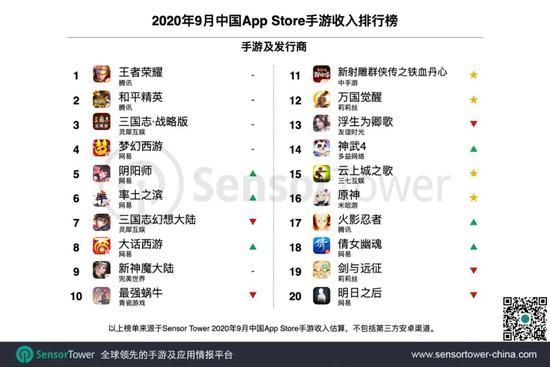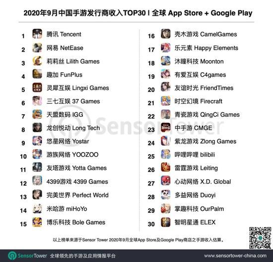 新浪科技讯 10月9日上午消息,Sensor Tower商店情报平台显示,2020年9月中国手游发行商在全球 App Store 和 Google Play 的收入排名。榜单中30家厂商9月全球吸金19.2亿美元,占当期全球手游总收入28.8%。
