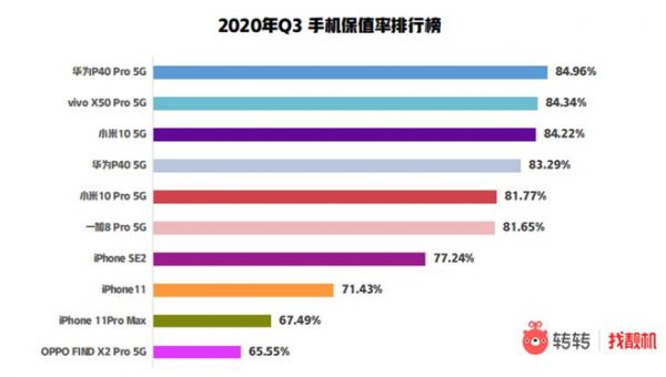 报告显示,多款国产手机的保值率超过80%。其中华为上半年旗舰机型P40 Pro 5G以84.96%的保值率位列第一,vivo X50 Pro (8+128G)和小米10(8+128G)则分列二到三位。