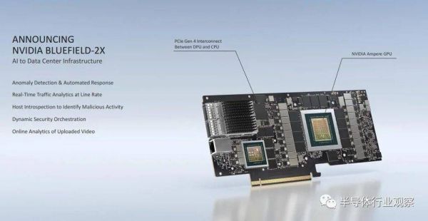 除了BlueField-2 DPU之外,英伟达还带了BlueField-2X DPU,这款产品除了拥有BlueField-2 DPU的所有特性以外,还集成了一个NVIDIA Ampere GPU,这就让其可以运用AI来执行数据中心的安全、网络和存储等任务。