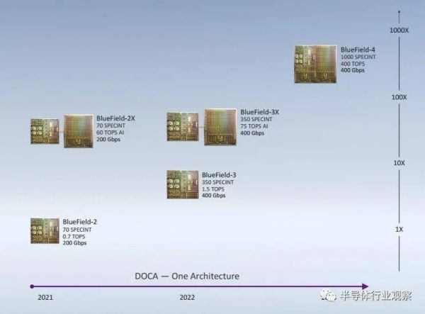在介绍了这两款DPU之后,英伟达还带来了DPU的全新路线图。如下图所示,英伟达未来两代的DPU将在2022和2023年面世,它们所带来的性能提升是非常明显的。