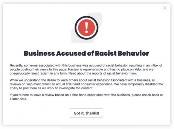 Yelp在博客中写道,“现在,当一家企业被报告存在种族主义行为(例如使用种族主义语言或符号),而引起公众注意时,Yelp将在企业Yelp页面放置一个新的警报,提醒企业被指控存在种族主义行为。”