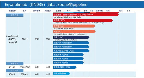 「思路迪医药」现阶段管线包括两个临床阶段候选药物:全球首个皮下注射PD-L1抗体KN035 (2017年FDA/NMPA/PMDA获准开展临床研究);高选择性FGFR-1/2/3抑制剂3D-185(思路迪医药拥有肿瘤和肺纤维化领域的全球开发权)。KN035全球共计六项临床试验在美、中、日同步进行,两项关键注册临床研究在中国开展,首个适应症预计2020年提交上市申报。