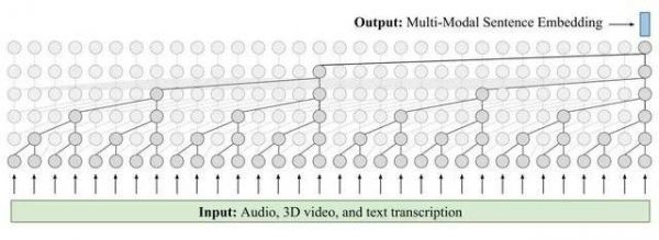 整个模型由两个部分组成。第一个部分为句子级嵌入式(Sentence-LevelEmbeddings),即整个句子多模态嵌入,可实现捕捉更长时间的声音、视觉和语音元素。第二个部分为因果卷积网络(C-CNN, CausalConvolutional Networks)。