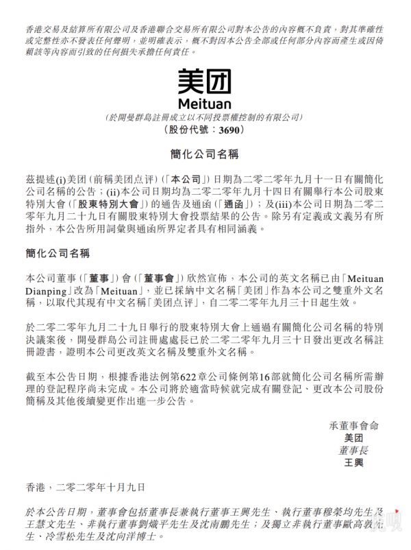 @虎嗅【美团点评:公司名称简化为“美团”】美团点评公告,公司的英文名称已由“Meituan Dianping”改为“Meituan”,并已采纳中文名称“美团”作为公司双重外文名称,以取代其现有中文名称“美团点评”,自2020年9月30日起生效。