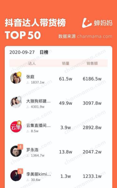 蝉妈妈数据显示,抖音仅头部前五主播单日带货金额就接近1.5亿