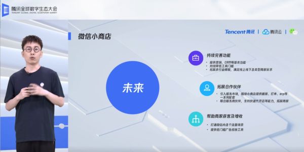 在今年9月份召开的腾讯全球数字生态大会上,腾讯披露了视频号的后续计划。腾讯宣布,未来的微信小商店功能即将会打通微信内各个流量场景,其中就包括视频号,微信小商店还将引入服务商、提供更多的经营工具、广告工具等服务,小程序将是腾讯私域生态的重要组成部分。