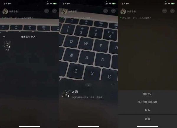 在主播端,主播点击在线观众后可以看到观众的 ID 和头像,主播也可以对用户进行禁止评论,移入视频号黑名单或投诉等操作。