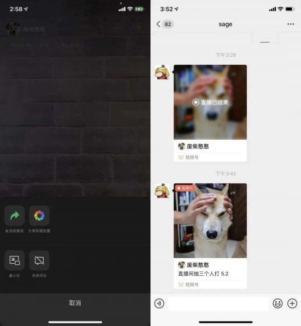 通过右上角的「...」,用户可以将直播分享至好友或朋友圈,也可以关闭评论或对直播窗口进行最小化等操作。最小化的直播窗口和视频聊天窗口最小化的效果一致,用户可以拖动窗口改变其位置,再次点击即可重新回到直播界面。
