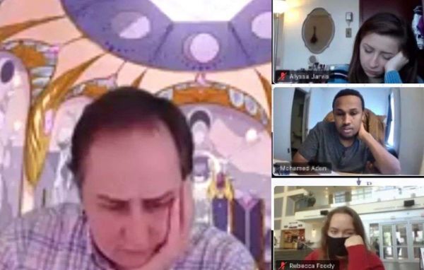 他们总是在半夜上课,动物也被吵得睡不着觉。有一次,狗干脆爬上书桌,凑到电脑摄像头前,狗的大头占据了屏幕,全班人都知道了。