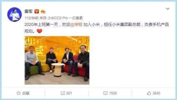 2020年1月2日,雷军在微博上宣布,前联想集团副总裁、中国区移动业务负责人常程加入小米,担任小米集团副总裁,负责手机产品规划。常程也发布了朋友圈,他提到,加入小米是最美的期待,“2020拼搏从第一天开始。”