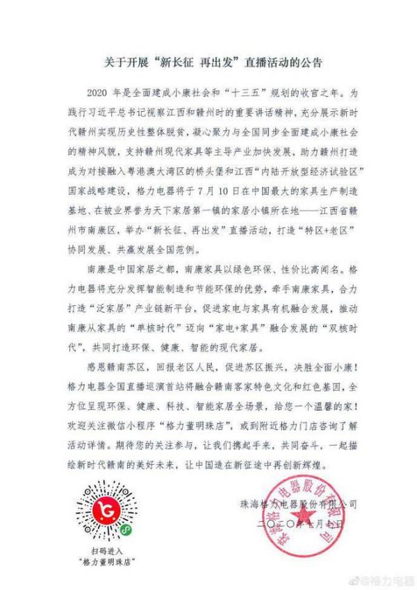 从最初直播为线下经销商“探路”,到拉上3万家专卖店一起搞直播,再到单日直播销售突破百亿,董明珠的直播进阶之路走得快且稳。7月7日,格力电器又发布公告称,要在全国巡回搞直播,第一站定在了江西赣州,时间是7月10日。