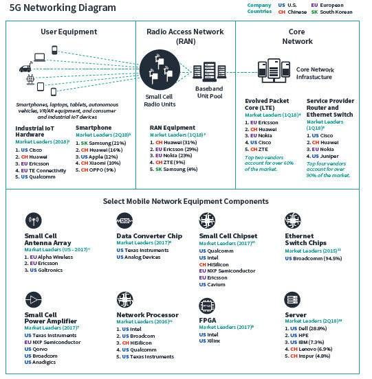 FPGAs的主要供应商只来自美国。许多组件可以组合成一个“芯片组”。小型电池芯片组的制造商包括三星、爱立信和华为,以及外部芯片组制造商如英特尔、高通、Cavium和NXP。美国、欧洲和日本公司在这些芯片组的零部件供应方面占据主导地位。
