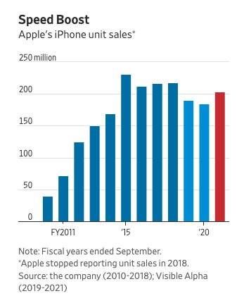 多位苹果股票分析师已经重新开始使用“超级周期”这个词汇。过去,超级周期被用来预测iPhone的旺盛销售周期,但并不总是很准确。根据投资技术公司Visible Alpha通过对分析师调查得出的一致预期,截至明年9月的2021财年,苹果iPhone的总销量预计将增长10%至2.038亿部,结束过去两年的连续下滑。