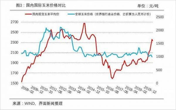 对比我国玉米现货均价与世界银行商品玉米价格,可以发现,2014年以来,我国玉米价格波动幅度远超相对平稳的国际玉米价格。