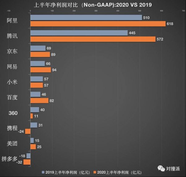 在盈利端,阿里、腾讯两家领跑,上半年非美国通用会计准则净利润分别达到618亿元、572亿元,平均每天盈利超3亿元。