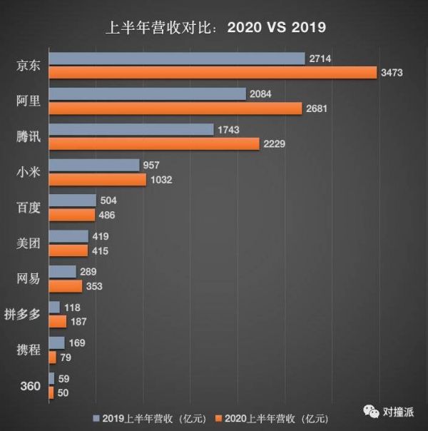 营收端,以小米(1032亿)为参照,上面京东、阿里、腾讯三家领跑,京东营收相当于3个小米,阿里、腾讯营收相当于两个多小米。值得一提的是,京东、阿里、腾讯这三家营收最高的公司,在2020上半年的增长幅度差不多,为28%~29%。