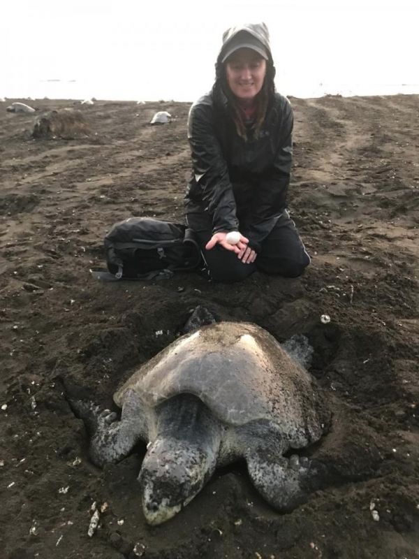 Helen拿着一个诱饵海龟蛋,和一只海滩上的海龟