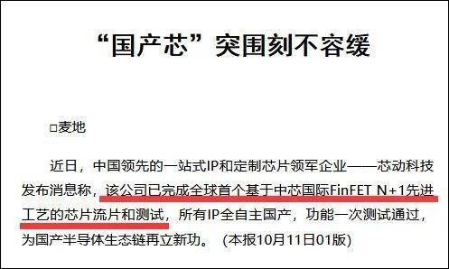 10月11日,珠海市委机关报《珠海特区报》发布报道,IP和定制芯片企业芯动科技已完成全球首个基于中芯国际FinFET N+1先进工艺的芯片流片和测试,所有IP全自主国产,功能一次测试通过。