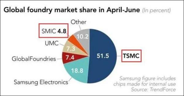 今年二季度全球晶圆代工市场份额:台积电51.5%,三星18.8%;GlobalFoundries(格芯)7.4%,联电7.3%,中芯国际4.8%。数据来源:TrendForce