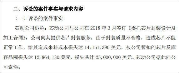 该公司称,芯动与长电科技在2018年3月签订《委托芯片封装设计及加工合同》,后者向其提供芯片封装服务,由于封装质量不合格,造成芯片不能正常工作,给其造成来料成本损失达1415.1万美元,被长电科技暂扣的芯片及库存晶圆损失达1286.4万美元,损失共计2500万美元。