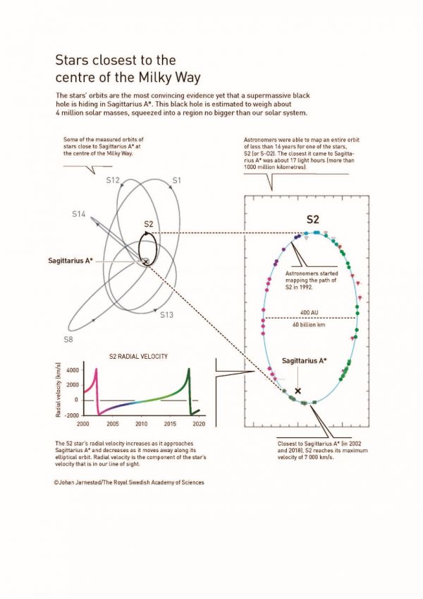 两个小组得到了非常一致的结果,确定了Sgr A*中心具有集中的质量4百万太阳质量,被认为是超大质量黑洞。因此S2与星系中心的距离17光年是黑洞施瓦西半径的1400倍。近红外和X射线耀斑在同一个位置被观测到,被认为来自被黑洞吸积的物质。