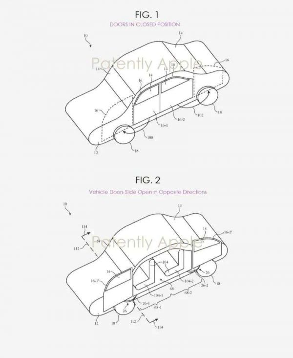 首先在车门上,就能看到苹果人性化的一面。除了传统打开车门的方式,车门还能基于车身传感器的数据自适应定位。在狭窄的停车位,两边都有车辆的时候,车门就能以滑动形式打开,如下图所示: