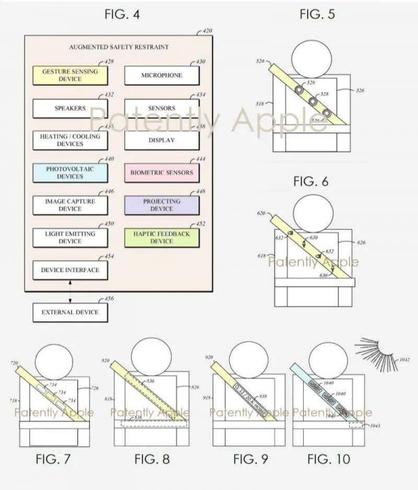 在 2019 年公布的一项专利中,苹果在最不起眼的安全带上动了手脚。根据专利描述的信息,在采用自动驾驶模式后,用户在车内就拥有了休闲时间,可以与他人交流或者观看内容。安全带在其中,就起到了一个「操作核心」的作用。
