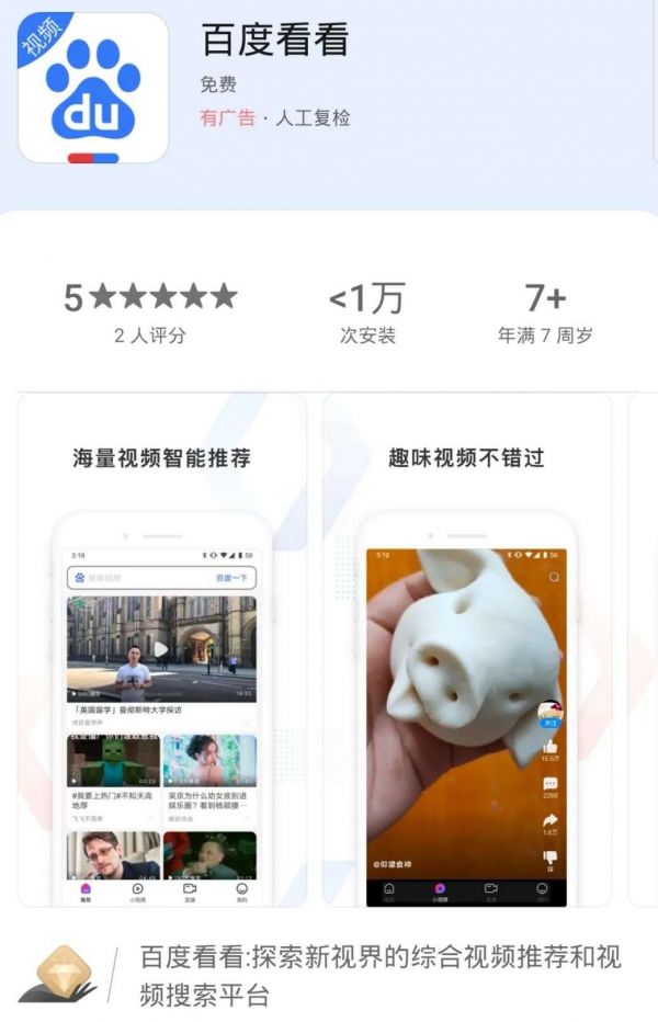 单论速度,直接在日活2亿多的手机百度上加入短视频通道是最快的,但百度没有这样做,他们的策略是从零开始重新扶植培育起另外一个日活超2亿的短视频手百。目前来看,百度看看APP仍处于低调上线期,百度并未大力宣传,截至发稿,其在APP store手机端上仅有21条评论,在华为应用市场上架首日仅2条评分和小于1万次的装机数,情况不容乐观。
