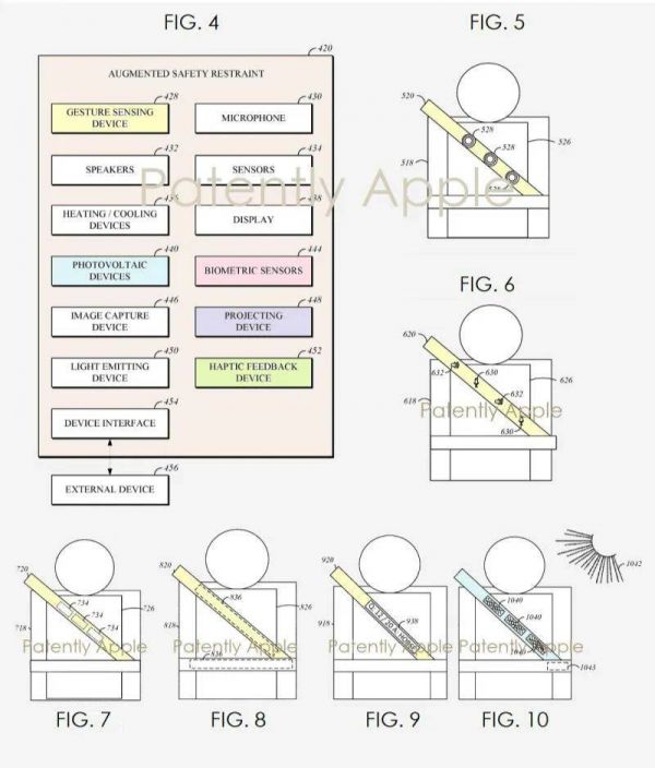 在 2019 年公布的一项专利中,苹果在最不起眼的安全带上动了手脚。根据专利描述的信息,在采用自动驾驶模式后,用户在车内就拥有了休闲时间,可以与他人交流或者观看内容。安全带在其中,就起到了一个“操作核心”的作用。