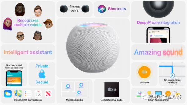这一次,苹果将S5用在了HomePod Mini上,带mini一词,大伙就知道这是一款平价产品,底部有一个驱动器、两个被动式喇叭和一个“声波波导”。与以往的 HomePod 一样,它可以提供高音质服务,内置智能助手,支持智能家庭管理以及一系列安全和隐私功能。