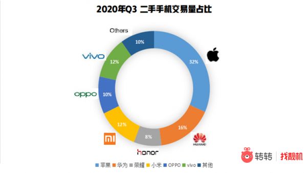 转转集团最新发布的《2020年三季度手机行情报告》提到,该季度二手市场iPhone依然热销,同时国产手机也开始强势分羹市场份额。该集团旗下转转和找靓机两大平台的B2C业务数据显示,今年三季度二手市场华为和荣耀手机的交易量占比之和达到了24%,已经可以和iPhone一较高下;小米OV在二手市场的交易量也增长迅猛,其中小米、vivo、OPPO在二手市场的交易量分别环比二季度增长了28.73%、23.62%和19.21%。