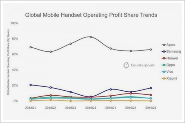 与此同时,iPhone在全球手机市场的利润比重也在快速下降。市场研究机构Counterpoint Research的数据显示:2017年,iPhone在全球智能手机市场总利润占有率一度高达92%,但这也是它至今为止盈利占比的最高纪录;到2019年第三季度,这一数据已经下滑至66%。