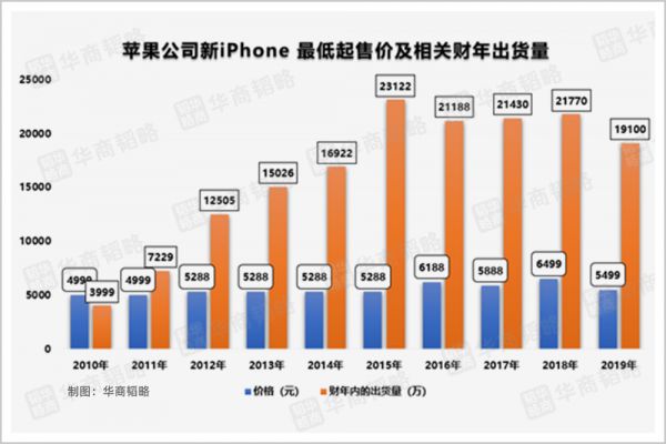 ▲因为苹果财年和产品发布时间的错位关系,价格和销量需要错开一年对应。比如2018年定价6499,其销量参考2019年出货量 1.91亿部