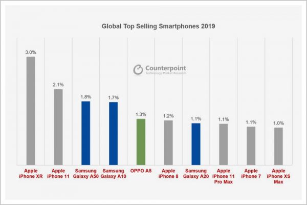 与此有关的事实是:根据市场研究机构Counterpoint在2019年发布的报告,iPhone在全球畅销机型榜单上,独占前十名的6个席位,而三星和华为的旗舰机型无一款入围。