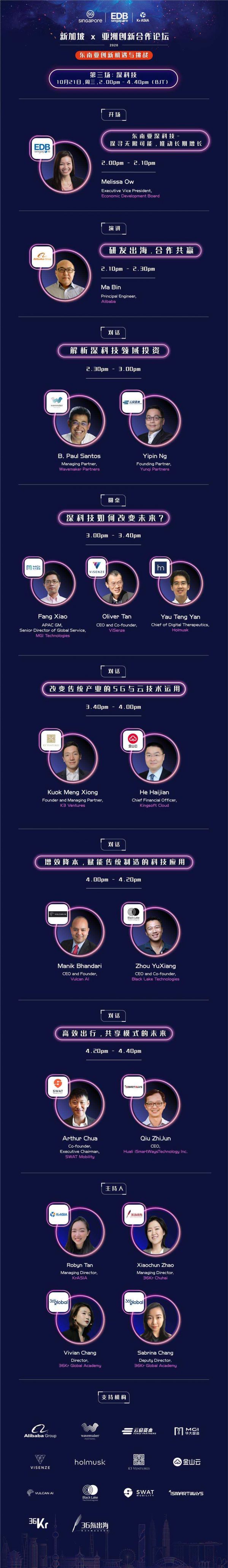 为了进一步促进双方的沟通与合作,打破投资和商业活动中的信息壁垒,新加坡经济发展局(EDB)联手 KrASIA 共同举办——新加坡 x 亚洲创新合作论坛2020,基于各自的资源优势,联动两个地区新经济领域里的顶尖投资机构和企业,分享在东南亚地区的投资和商业经验,共话当前面临的机遇与挑战。本次论坛分为智慧城市、金融科技和深科技三场主题活动。10月21日,第三场以深科技为主题的线上峰会将拉开帷幕。