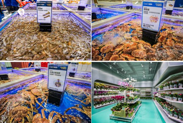 菜场型的海鲜区、花卉区,图片来自盒马官方