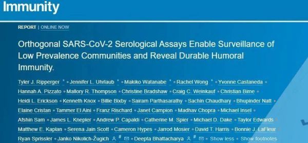 [1] Tyler J. Ripperger et al., (2020) Orthogonal SARS-CoV-2 Serological Assays Enable Surveillance of Low Prevalence Communities and Reveal Durable Humoral Immunity. Immunity. DOI: https://doi.org/10.1016/j.immuni.2020.10.004.