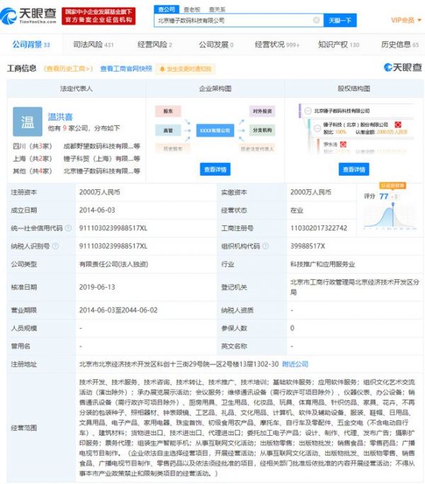 北京锤子数码科技有限公司成立于2014年6月,注册资本2000万人民币,法定代表人为温洪喜,由锤子科技(北京)股份有限公司全资控股,后者的法定代表人为罗永浩。