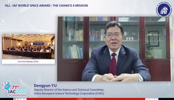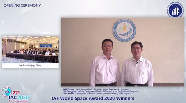 开幕式上最吸引人的环节是IAF主席帕斯卡尔、负责奖项的副主席木部征四郎宣布了2020年“IAF世界航天奖”获奖者是嫦娥四号团队优秀代表吴伟仁、于登云、孙泽洲。嫦娥团队代表在获奖感言中表示该奖项是对中国航天的高度认可,中国航天人将继续与国际同行一道,为世界航天发展做贡献。