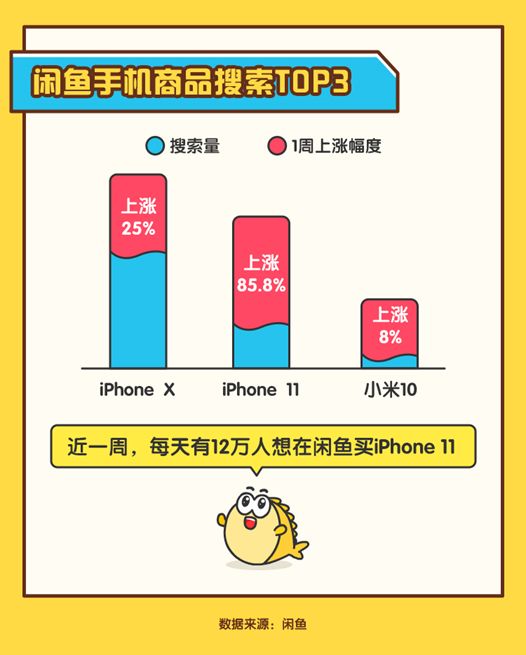 来自闲鱼的数据显示,近两周,平均每天有20万人在上面为旧手机估价。每天还有12万人搜索iPhone 11,等待换新和期待“捡漏”的人在这个阶段集中出现。