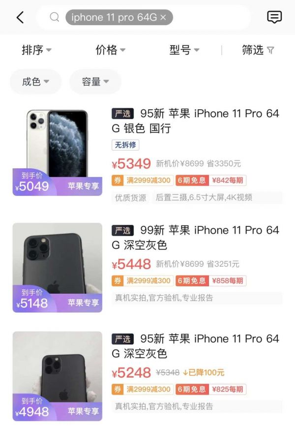 「电商在线」在各回收平台搜索发现,以iPhone 11 Pro 64G为例,二手购买价格在5000元左右,比原价8699低了四成多;九成新的回收价在4000元左右,相当于1年时间打了5折。