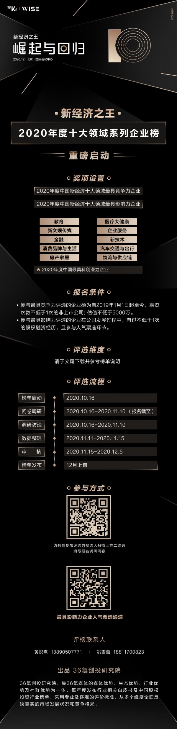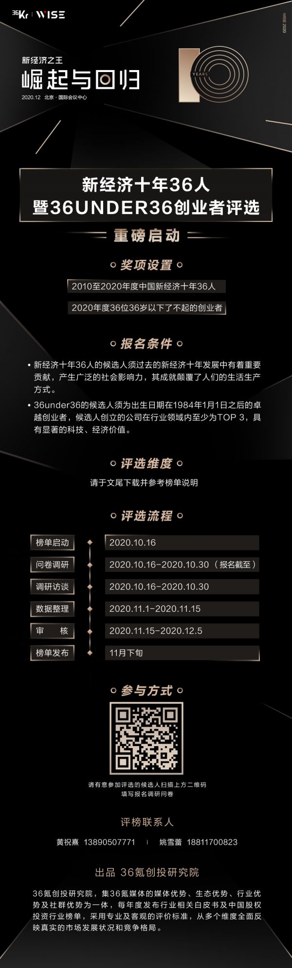 36氪重磅启动「2010—2020年中国新经济十年36人评选」,以褒扬那些真正改变我们日常生活、思考方式的关键人物。同时,我们也重磅启动36氪沿袭多年的——36UNDER36系列「2020年度36位36岁以下了不起的创业者」榜单评选,寻找那些远超同辈、代表未来新势力的卓越年轻一辈。