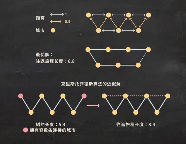 1976年,尼科斯·克里斯托菲德斯(Nicos Christofides)提出了一种算法,可以有效地找到TSP的近似解,并保证这种近似解中的往返旅程最多比最优解长出50%(近似比不超过3/2)。