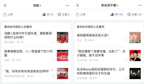 用户在对文章表达「点赞、在看、分享」等喜欢的互动动作后,将可以看到留言区顶部新增的「喜欢此内容的人还喜欢」版块,该版块将显示喜欢同一篇文章的其它用户喜欢的内容,包括公众号名称、文章标题、封面、点赞数,帮助用户进行延伸阅读。