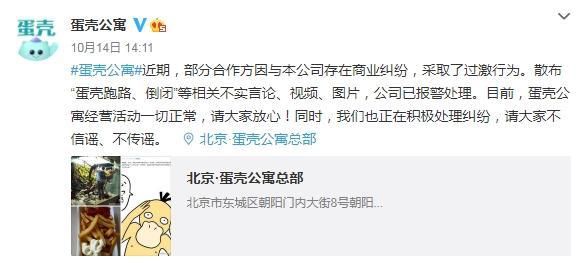 蛋壳公寓官方微博在14日下午疑似回应此事,表示不要轻信谣言,但该条微博很快被重新编辑,删除了回应部分的文案。随后,蛋壳公寓正式回应称,近期部分合作方因与公司存在商业纠纷,采取了过激行为,散布“蛋壳跑路、倒闭”等相关不实言论、视频、图片,公司已报警处理。目前,蛋壳公寓经营活动一切正常。