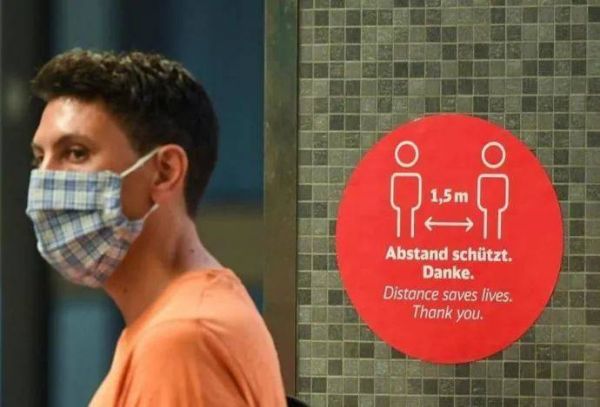 法兰克福一处地铁站提醒乘客保持身距的海报。图源:新华社